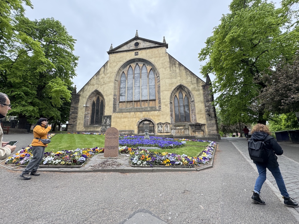 The castle took up a couple of hours of the day then we continued down High Street (The Royal Mile) for all of the shops, restaurants and pubs. We stopped at Greyfriar’s Bobby which is a pub named for the Greyfriar’s loyal dog, Bobby, who stayed by his grave for years. There is a statue out front of Bobby. The cemetery and gardens are out back. The restaurant/pub was very nice, and we tried Haggis, a national dish of Scotland, made of sheep’s organs, oatmeal, and spices cooked in a sheep’s stomach. It wasn’t half bad! We also tried neeps and tatties, mashed turnip and mashed potatoes – delish! Another place we tried for lunch on a different day that was good was George IV near the castle.